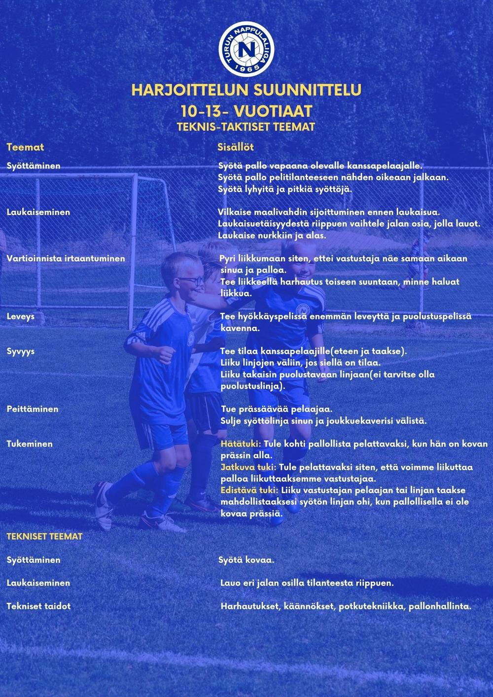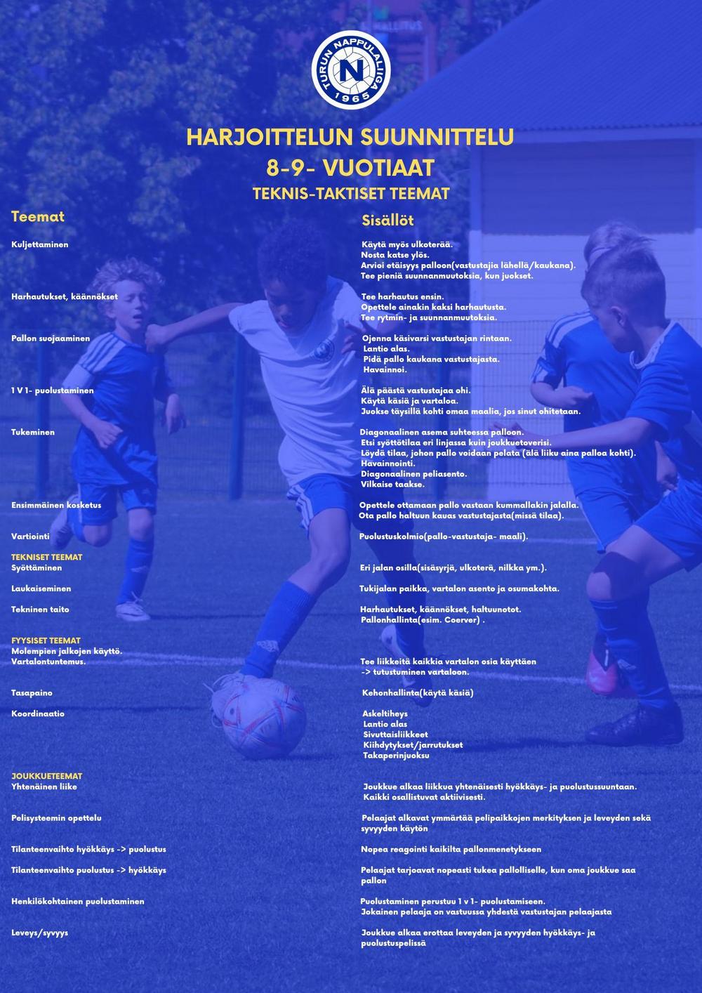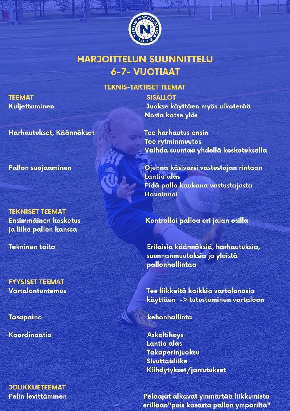 Valmentajan tulee huomioida ikäluokkakohtaiset painopisteet liikunnallisten taitojen opettamisessa kuin myös jalkapallotaitojen opettamisessa. Valmentajamme suunnitelevat harjoitukset niin, että pelaajat saavat paljon pallokosketuksia sekä pallotoiminnallisia tilanteita pelatessaan. Harjoituksissa edetään teemoittain keskittyen yhteen harjoiteltavaan asiaan useiden harjoitusten ajan, jotta oppimisvaikutusta saadaan mahdollisimman paljon.